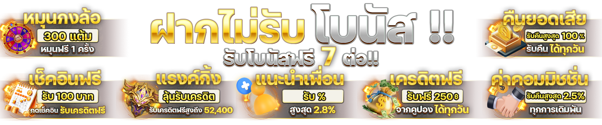 ตอบ : - โบนัสต้อนรับสมาชิกใหม่ 100% - คืนยอดเสียรายวันสูงสุด 10% - โบนัสแนะนำเพื่อน 20% - กิจกรรมแจกเครดิตฟรีประจำเดือน - โปรโมชั่นพิเศษตามเทศกาล